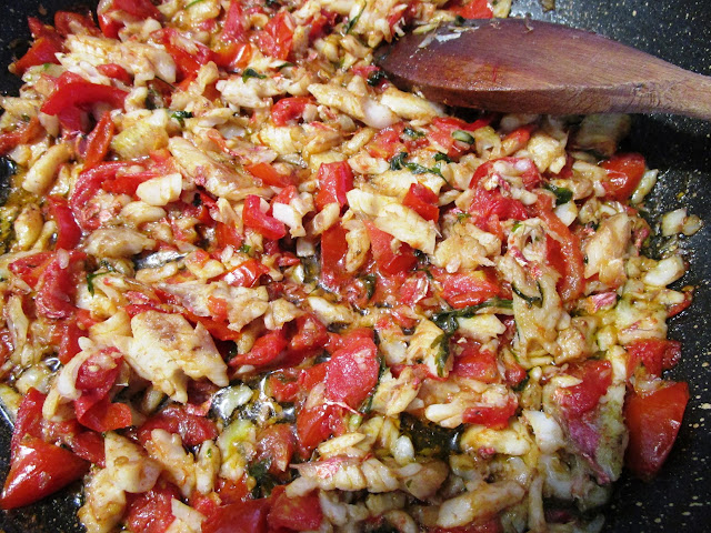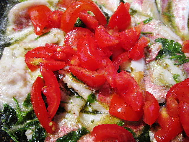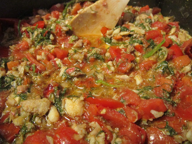 - aggiungere i pomodorini a pezzetti, il finocchietto tritato oppure i semi di finocchio, aggiustare di sale, mescolare delicatamente e cuocere per 5 minuti a fuoco bassissimo
