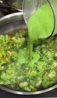 Trasferisci una parte dei broccoli nel bicchiere del frullatore e aggiungi un goccio di acqua di cottura. Frulla fino a ottenere una crema liscia e vellutata, senza grumi, quindi tienila da parte.