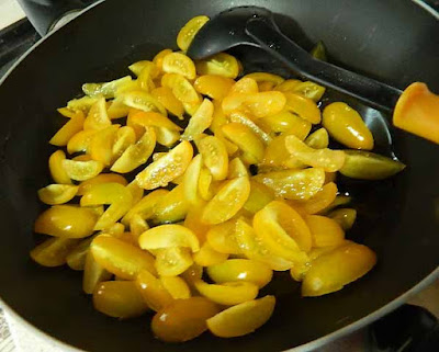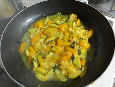 In un’ampia padella mettere a rosolare lo spicchio d’aglio, appena biondo toglierlo e aggiungere i datterini gialli già tagliati.
