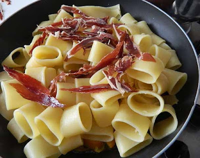 Scolare la pasta e metterla direttamente nella padella dei pomodorini, aggiungere il Prosciutto Iberico Bellota