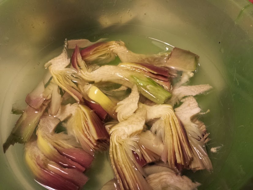 - mondare i carciofi, ricavare i cuori e tagliarli a fettine sottili, metterli a bagno in una ciotola con acqua e mezzo limone spremuto