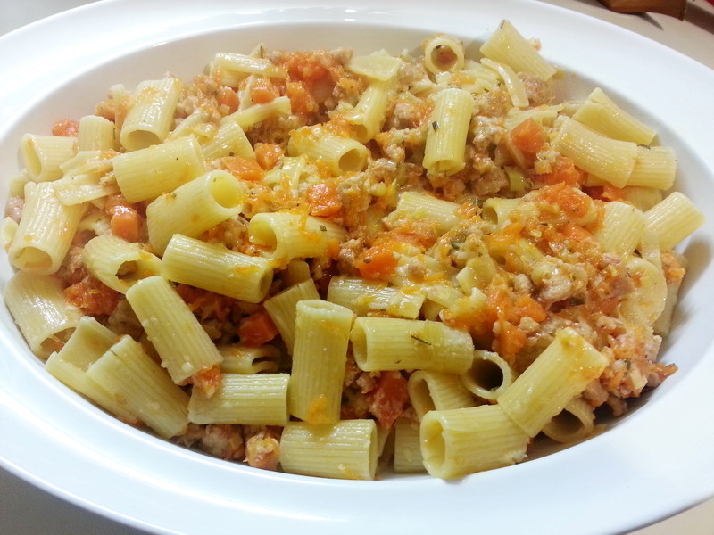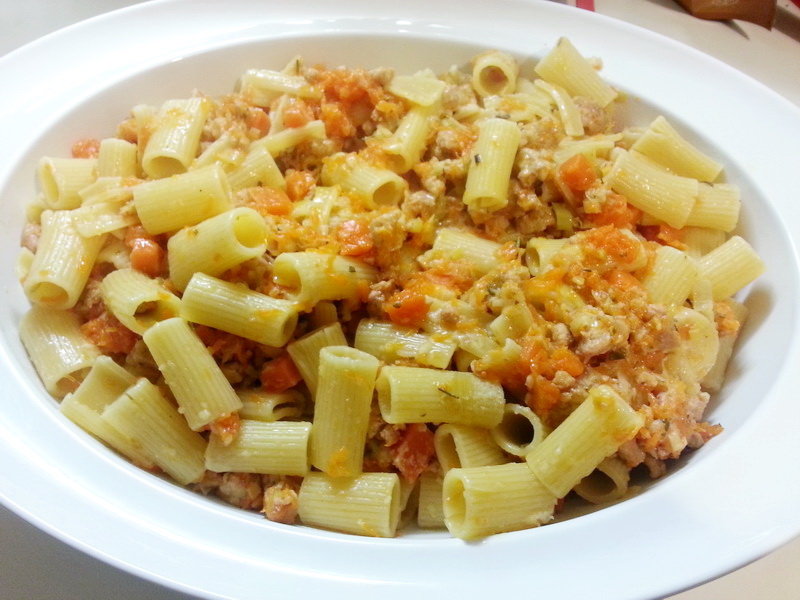 La pasta con ragù di zucca e salsiccia è un piatto rustico, ricco e sostanzioso, certo non dietetico ma molto saporito e di grande soddisfazione. Più un piatto unico che solo un primo, basta poi la frutta per farne un pasto completo. Questo sugo si presta bene a condire sia spaghetti che pasta corta, ma anche le tagliatelle.