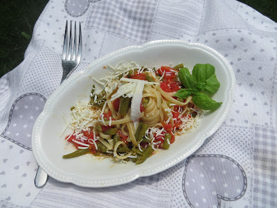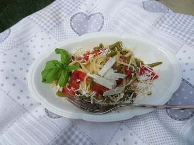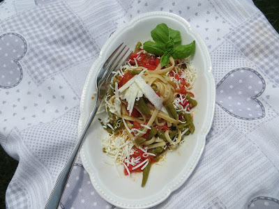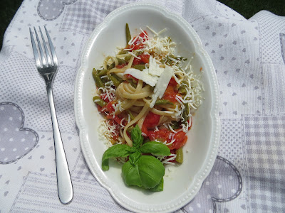 Lavate e pulite i fagiolini poi lessateli in acqua salata, per c.a. quindici minuti, i fagiolini devono rimanere croccanti.