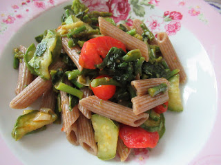 Tagliare le zucchine a rondelle e cuocerle in padella con un po’ di cipolla tagliata finemente ed un filo d’olio. Aggiungere i pomodorini a tocchetti e proseguire la cottura a fuoco medio. Cuocere per 10 minuti gli asparagi a tocchetti piccoli (al vapore o in acqua) ed aggiungerli in padella con le cime di rapa precedentemente giĆ ammorbidite in padella con poca acqua e coperchio, oppure aggiungere le cime alle zucchine all’inizio e coprire con un coperchio. Salare e condire la pasta cotta a parte.