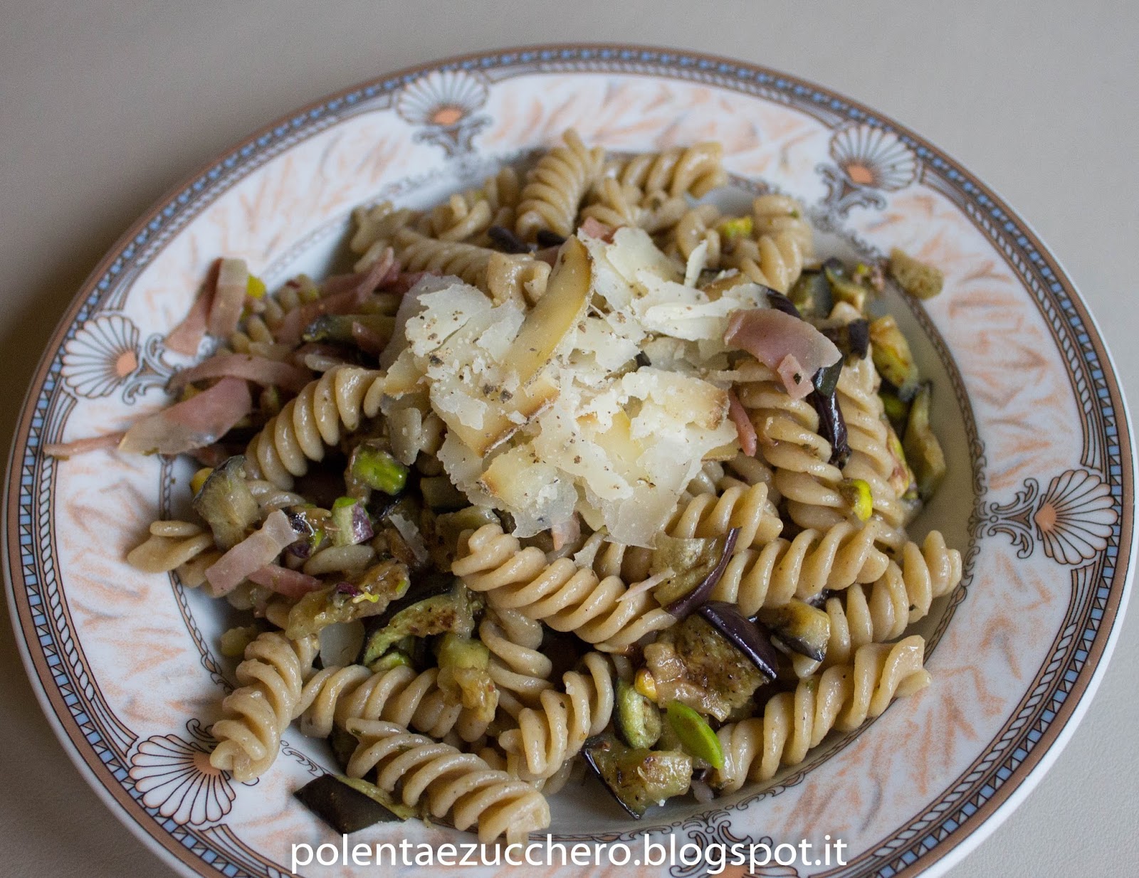 - Intanto preparare il sugo: tagliare tutte le fette di melanzana grigliate a filetti, scaldare una padella (meglio un saltapasta) sul fuoco e tostarvi i pistacchi poi aggiungere le striscioline delle melanzane.
