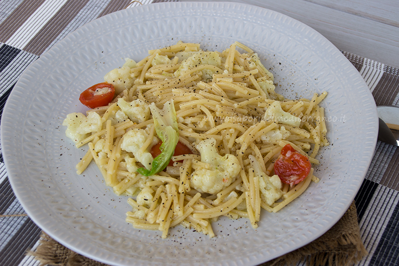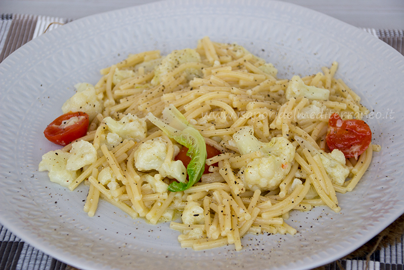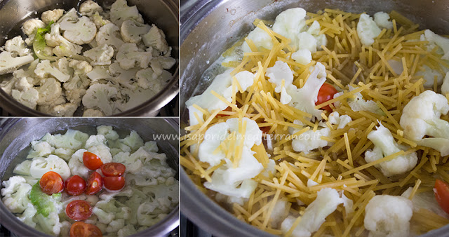 In una pentola abbastanza capiente versate 1.5 litri di acqua con un cucchiaio raso di sale; appena inizia a bollire versate i cavolfiori che farete cuocere per cinque-sette minuti. Trascorso questo tempo aggiungete i pomodorini freschi tagliati a metà e i vermicelli spezzati. Durante la cottura fate attenzione che l’acqua superi sempre di poco la pasta, se l’acqua scende sotto il livello della pasta aggiungetene altra (bollente).