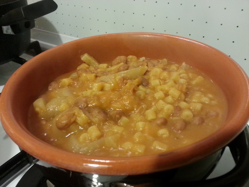 In un tegame preferibilmente di coccio scaldare 3 cucchiai d’olio con la cipolla tritata. Aggiungere la patata tagliata a fette e farla insaporire un attimo, poi aggiungere la passata di pomodoro, peperoncino a piacere e un bicchiere d’acqua, coprire e far bollire per 5-6 minuti. Quando le fette di patata saranno morbide schiacciarle con una forchetta. Schiacciare anche un terzo dei fagioli lessati e aggiungere anch’essi nella pentola. Versarvi poi 2 bicchieri d’acqua (possibilmente l’acqua in cui si sono cotti i fagioli, tenuta da parte), mescolare e portare a ebollizione. Regolare di sale e versare nel brodo la cotenna tagliata a striscioline e i fagioli interi. Lasciare insaporire per qualche minuto, poi quando riprende l’ebollizione versarvi la pasta. A fine cottura della pasta il brodo dovrà essere piuttosto denso.