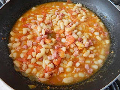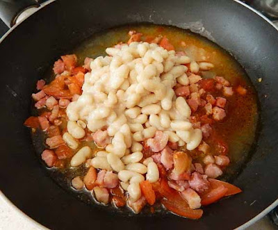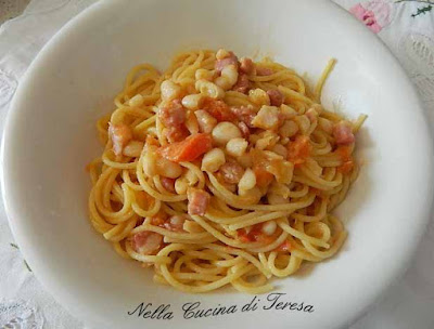 Spegnere il fuoco sotto la padella, cuocere gli spaghetti, scolarli al dente mettendoli direttamente nella padella con il sugo dei fagioli,