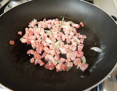 In un’ampia padella mettere la cipolla affettata finemente con due cucchiai di olio extra vergine d’oliva e la pancetta affumicata,