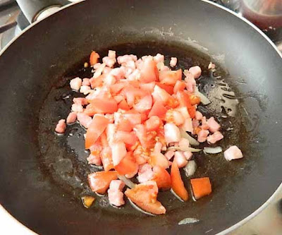 lasciare rosolare il tutto molto dolcemente, poi aggiungere i pomodorini tagliati in quattro parti e lasciamo appassire per 5 minuti.