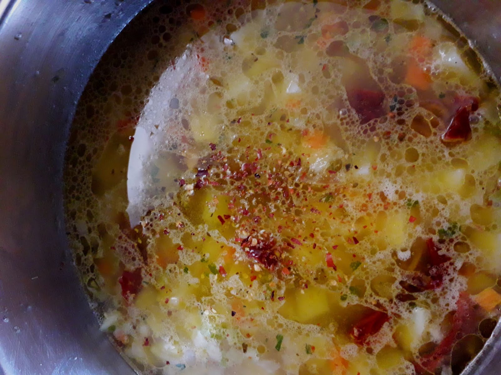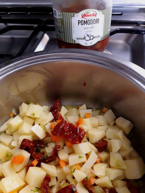 uniamo poi le patate,mescoliamo e dopo pochi minuti aggiungiamo 2 bicchieri di scqua,copriamo