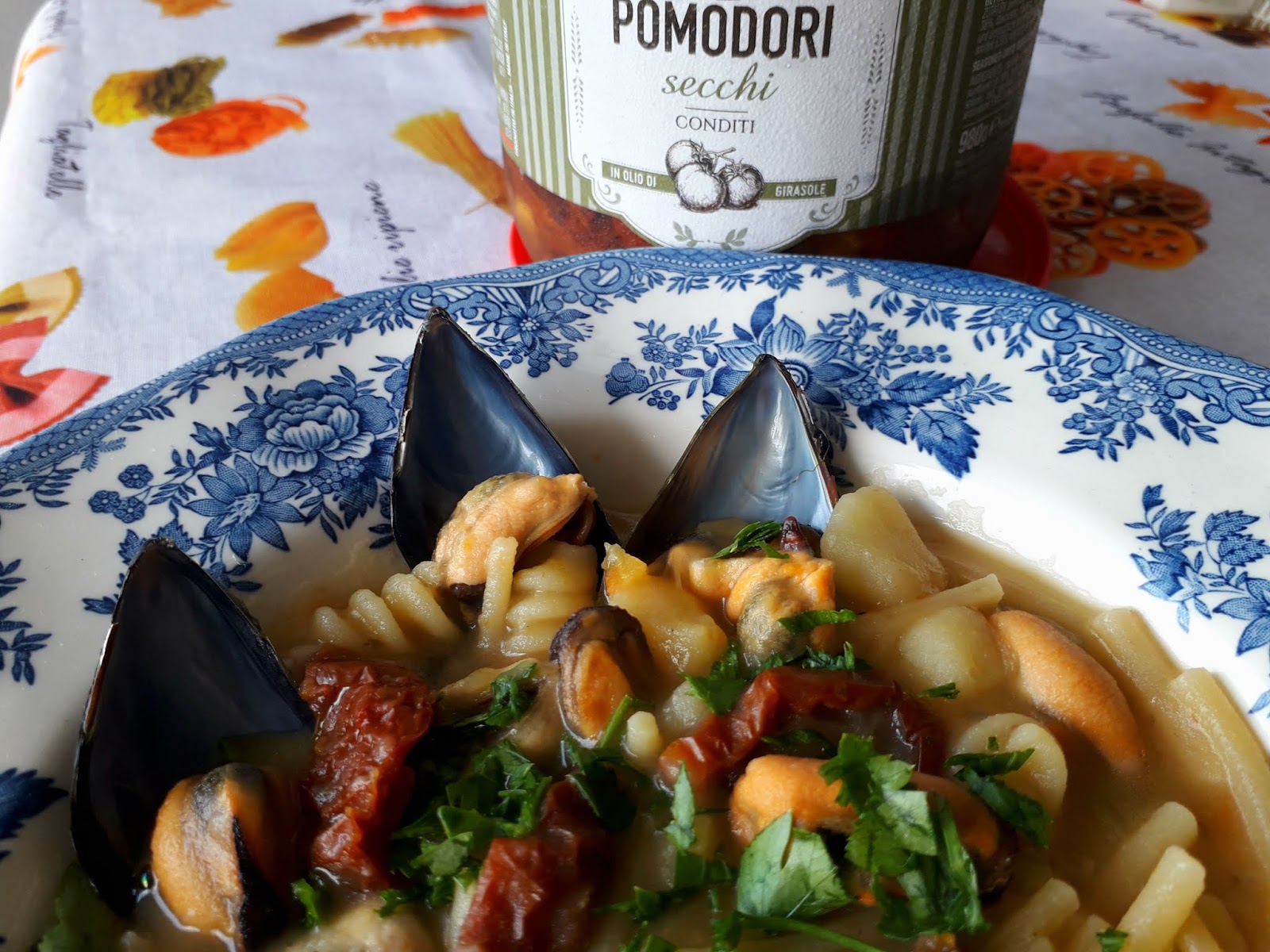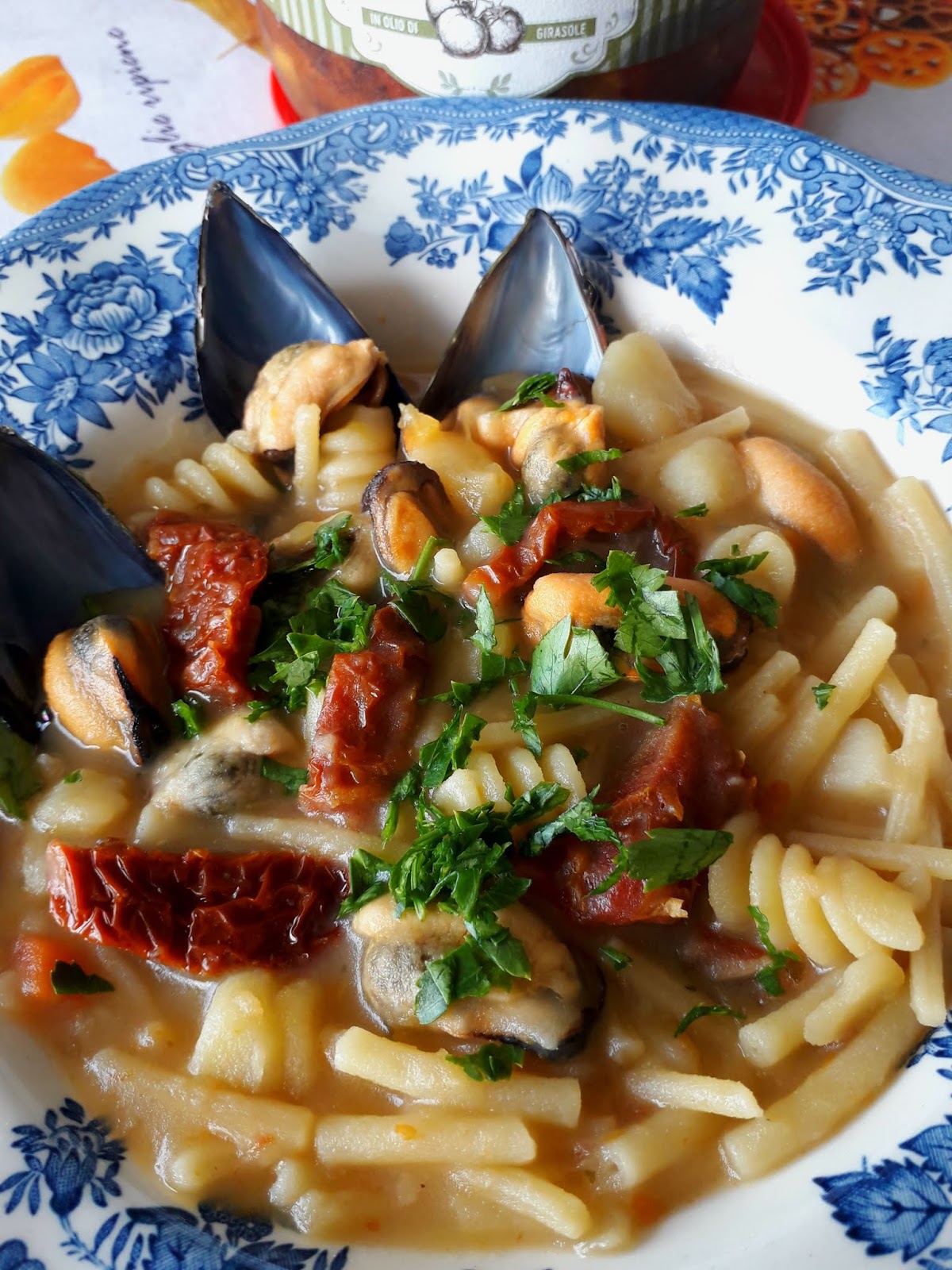 1 kg di cozze (cotte in 2 dita d’acqua x pochissimo tempo