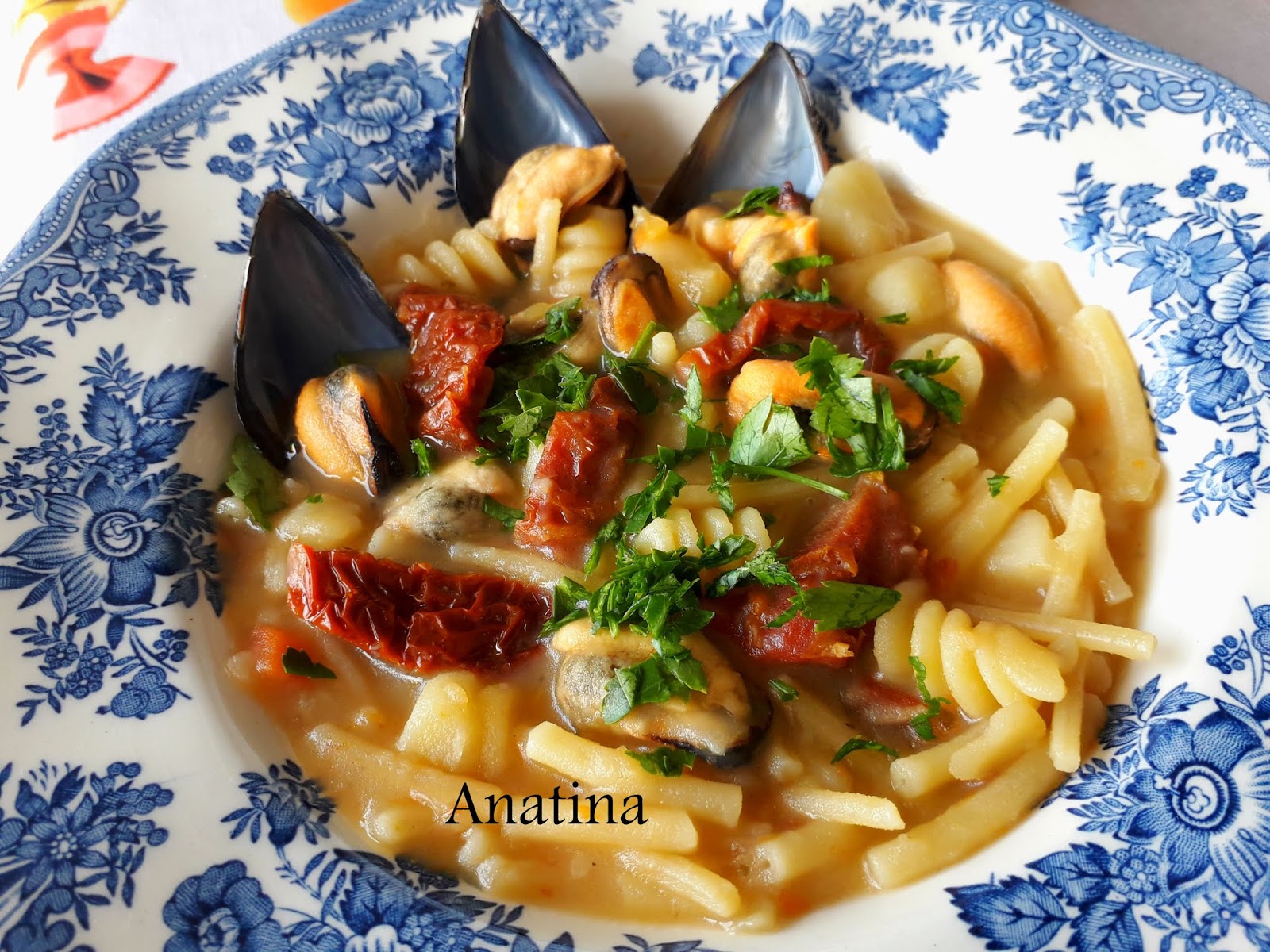 e portiamo a cottura.Intanto che cuociono ,prepariamo le cozze che una volta cotte toglieremo dal guscio eliminando il bisso e metteremo da parte con un poco del liquido di cottura filtrato.
