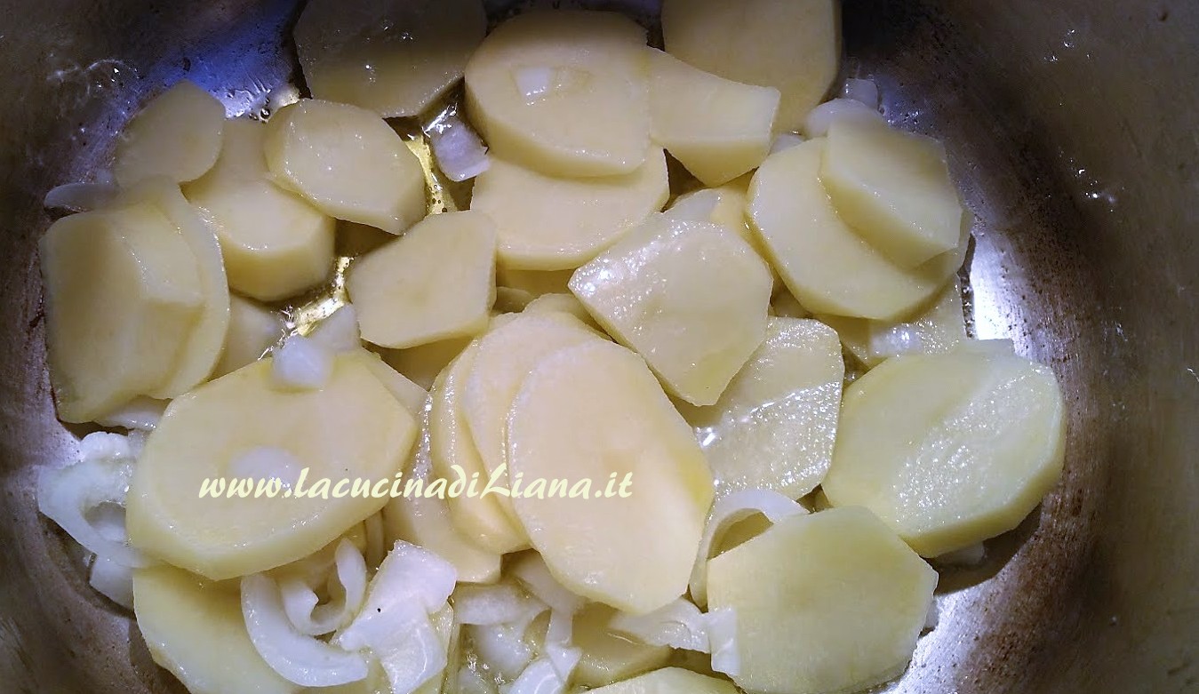Rosolare in poco olio la cipolla tritata, aggiungere le patate tagliate a fettine, quindi versare il brodo, aggiungere la pasta, chiudere la pentola a livello di pressione 1 e impostare il timer a 10 minuti dopo il fischio. Riaprire la pentola, aggiustare di sale, impiattare la pasta e condirla con prezzemolo e scaglie di parmigiano.