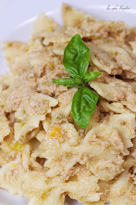 Con la bella stagione si ha voglia solo di piatti freschi e leggeri, così ho pensato di preparare un pesto di tonno che mi fa pensare tanto all’estate ed alle vacanze da abbinare ad un piatto di pasta formato farfalle che mi fanno pensare alle insalate di pasta fredda!!!! In questo caso oltre al tonno ho messo dei peperoni in agrodolce, formaggio grattugiato, olive verdi denocciolate ed olio d’oliva, ingredienti semplicissimi che si hanno sempre in casa e se volete aggiungere un po’ di calorie: un cucchiaio o anche più di maionese…magari allo yogurt!