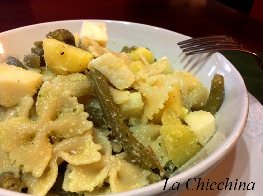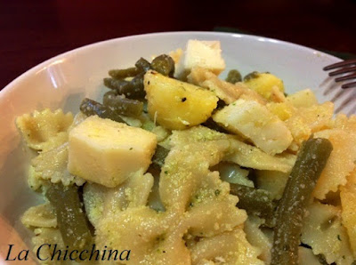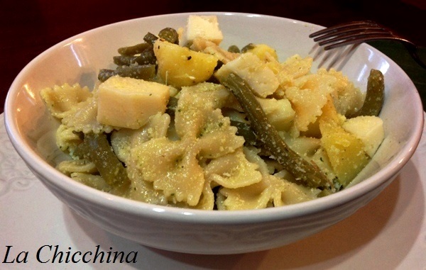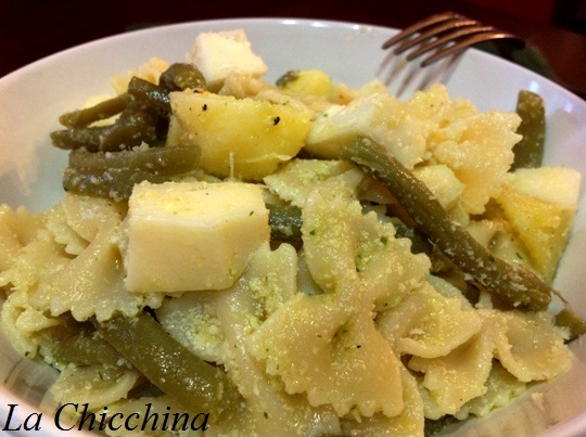 Quella che vi propongo oggi è molto buona: è condita con un pesto leggero in cui la quantità di basilico ed aglio è contenuta, così da non coprire il sapore degli altri ingredienti.