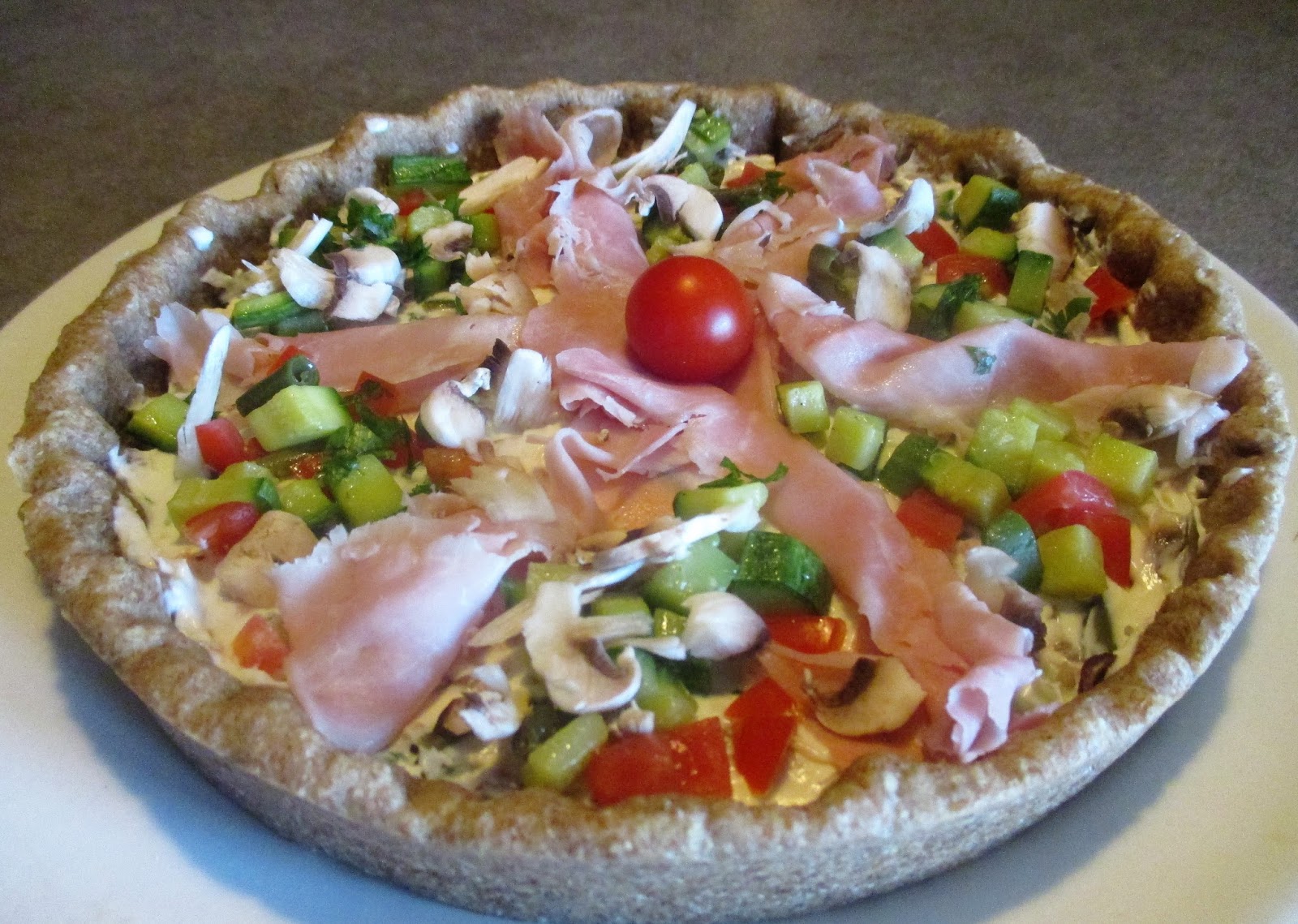 Take a bowl and put the fresh cheese and the fresh cheese, mashed with a fork. Now add the chopped ham end, diced tomatoes and grilled vegetables. Mix well then place the filling into the pie. Spread the mixture well then garnish as I did. Serve at room temperature.