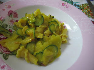 Affettare patata e zucchine in fette sottilissime e cuocerle in padella con cipolla ed olio. Aggiungere un po’ d’acqua e quando sarà cotto aggiungere la panna (tenuta in frigo fino a questo momento perchè tende a sciogliersi facilmente). Aggiungere sale e zafferano, mescolare e farci saltare la pasta cotta a parte precedentemente.