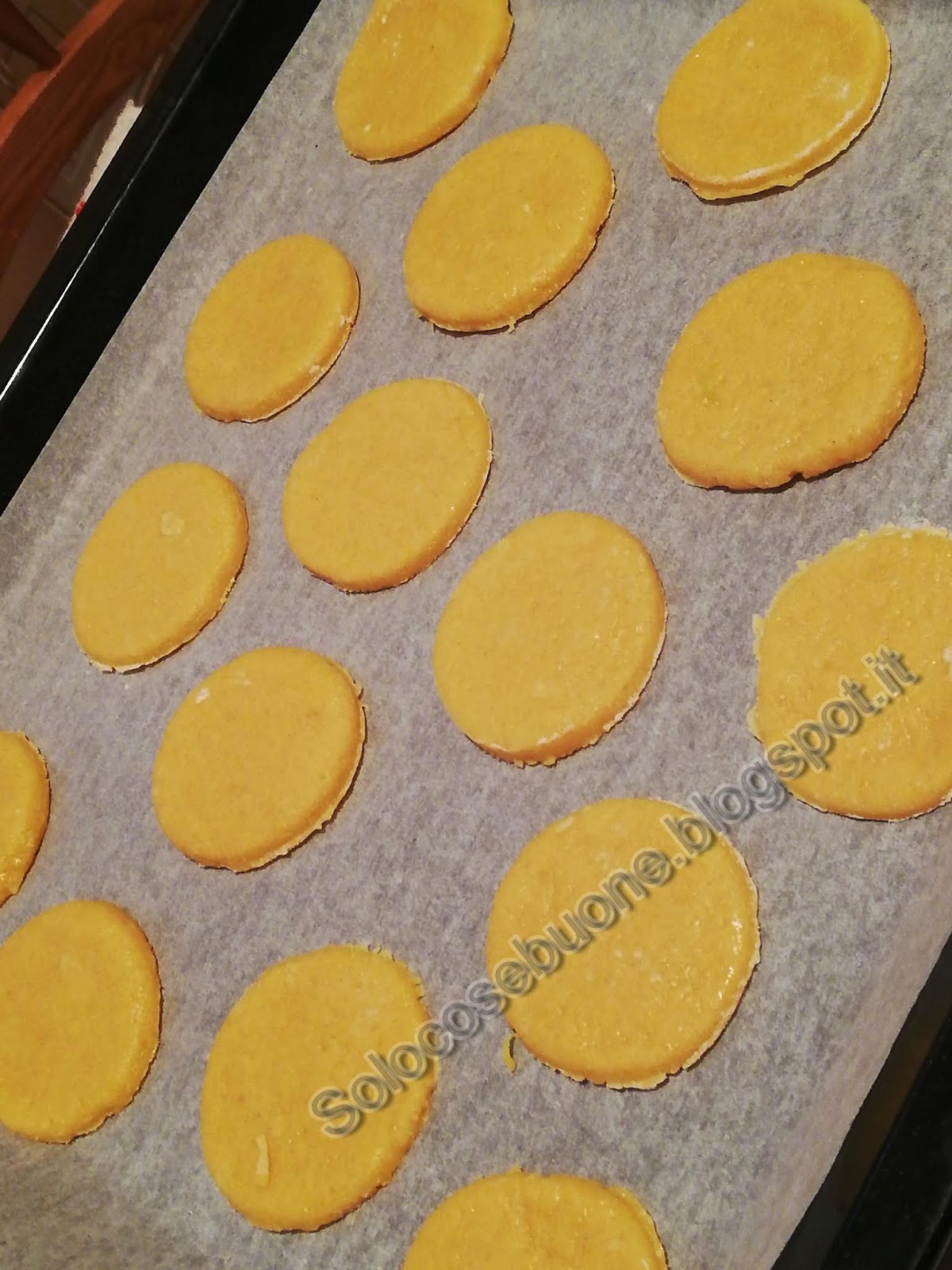 Con l’aiuto di una formina o di un piccolo bicchiere ritagliare tanti biscotti di forma tonda e disporli su una teglia ricoperta di carta forno.
