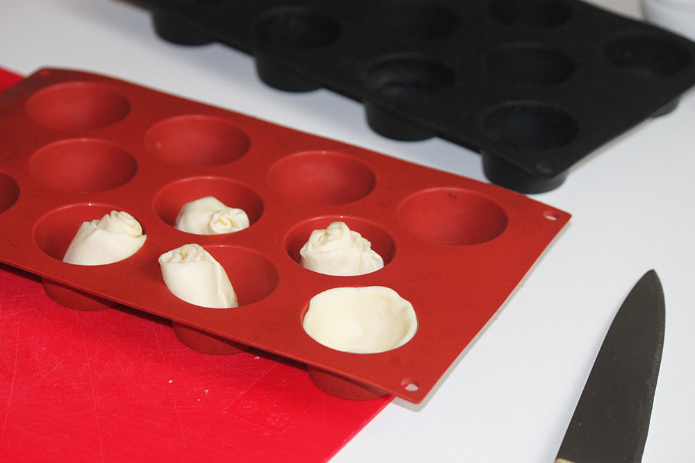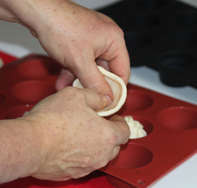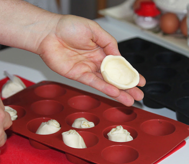 English. Take the store-bought sheet pastry, roll them and cut in pieces of about 3 cm height each one. Take each roll and press the thumbs just in the middle to create a recess. You have to get a kind of small cup to fit the mini-muffin mold. Work with cold hands. Even the pastry has to be the coldest you can have.