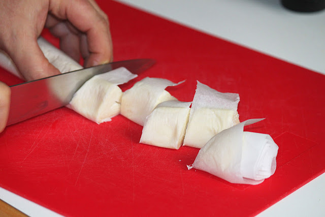 Español. Cómo masa de hojaldre, hemos utilizado dos paquetes de masa de hojaldre lista, compradas en el supermercado. Utilice la masa de hojaldre todavía enrollada y cortar las piezas de aproximadamente 3 cm. Tome cada pieza de masa entre las dos manos: Con los pulgares, empuje el centro para crear un surco.