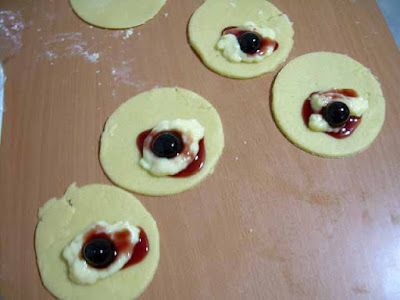 quindi su una metà della forma mettere un cucchiaino di crema pasticcera, ormai fredda, e una amarena,