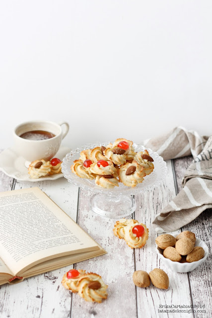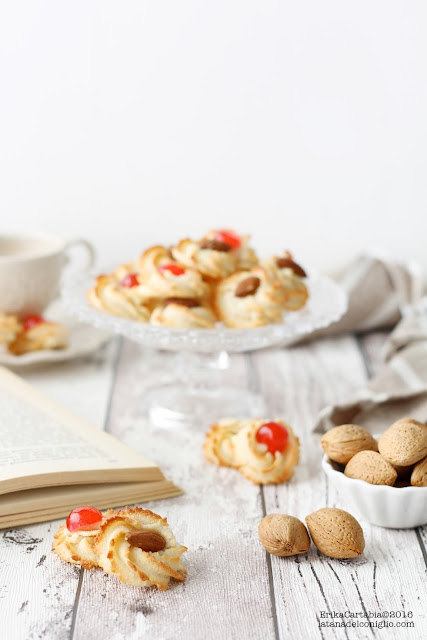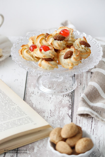 La lavorazione è infatti molto semplice, vi basterà armarvi di un buon mixer o frullatore, una ciotola e una sacca da pasticcere con bocchetta a stella (meglio quella classica, larga, come questa). La parte più “difficile” arriva nel momento di formatura del biscotto, ma molto dipende da quanto sarete bravi ad azzeccare la giusta consistenza dell’impasto. Per riuscire a lavorarlo al meglio e fare in modo che non si “appiattisca” durante la cottura, dovrete trovare il giusto compromesso per avere una pasta non troppo molle ma nemmeno troppo soda e difficilmente lavorabile con una sacca da pasticcere. Per questo motivo consiglio di aggiungere poco albume alla volta. La consistenza è vagamente simile alla frolla, ma più morbida e “collosa”. In ogni caso testate poco impasto con la sacca da pasticcere e vedrete che sarà molto più facile a farsi che a dirsi!