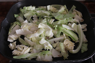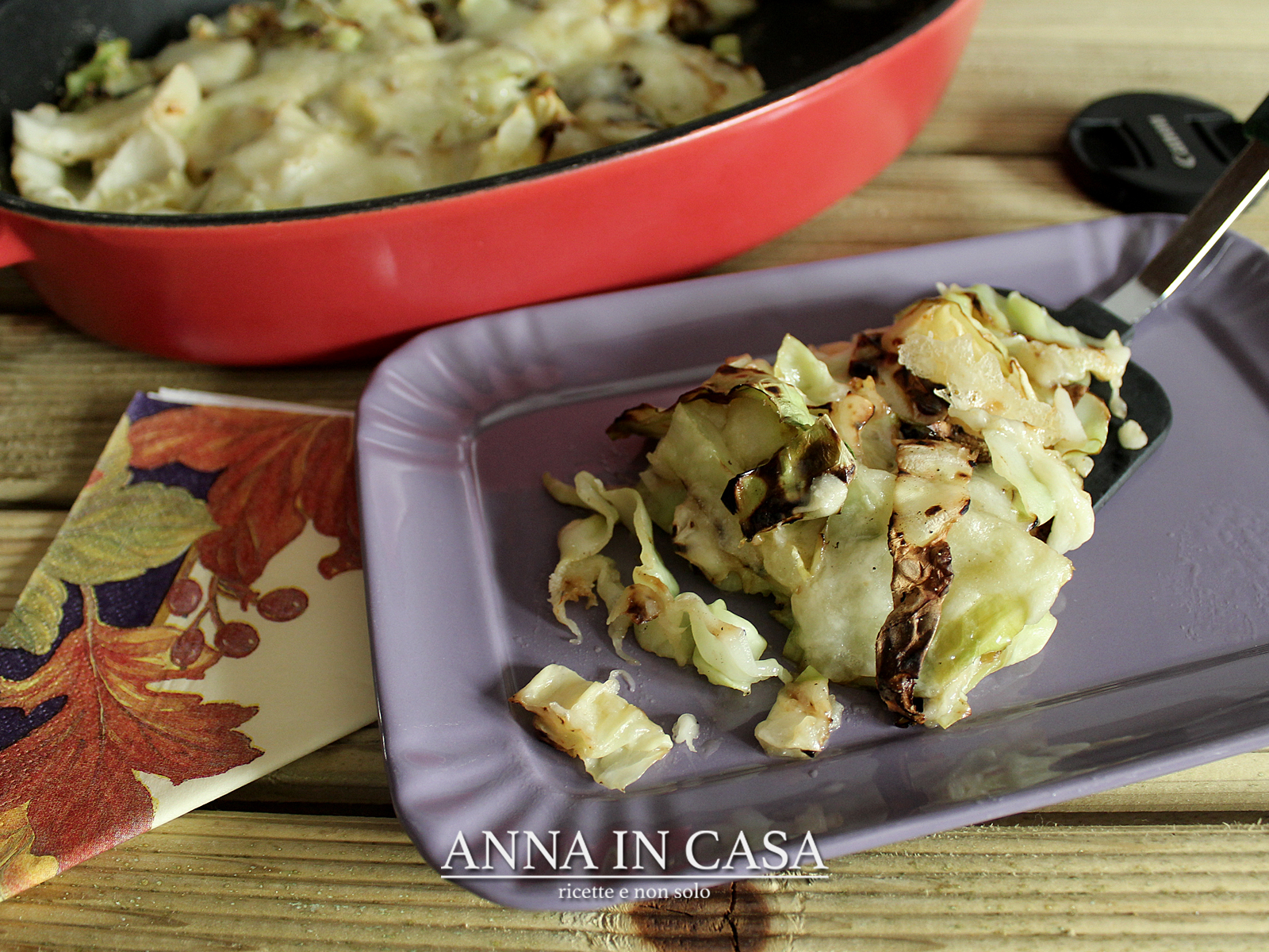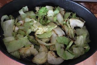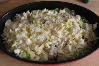 Stendere metà del cavolo grigliato sul fondo della teglia precedentemente unta, cospargere con metà del quantitativo di formaggi duri, e coprire con una manciata di formaggio grana e formare un secondo strato di cavolo.