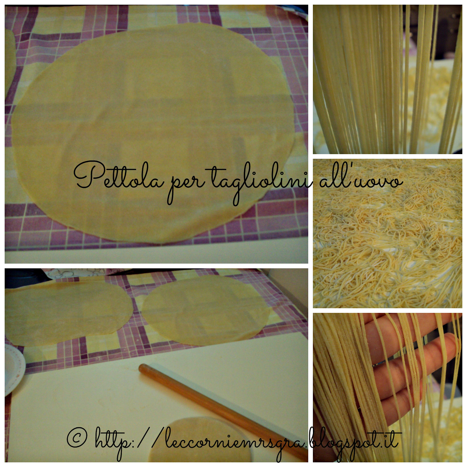 Per prima cosa è necessario preparare i Tagliolini almeno 2 o 3 gg prima di cuocere le pastiere. Gli stessi vanno preparati con il tipico procedimento della pasta all’uovo per cui, formate una fontana con la farina, versate al centro le uova, sbattetele e piano piano incorporate tutta la farina. Appena ottenuto un impasto liscio ed omogeneo, procedete a stendere l’impasto a mano oppure con la nonna papera. Mentre stendete la pasta all’uovo, tenete coperta con un panno leggermente umido la sfoglia già pronta altrimenti, si seccherà prima del momento di tagliarla. Formate i tagliolini con la nonna papera oppure, a mano se siete bravi. Stendete su un tavolo di legno e lasciate seccare. Il giorno della cottura ponete la vostra pasta ormai secca in un canovaccio pulito, chiudetelo con un mano, sbriciolate i vostri tagliolini e infine, setacciateli, per togliere la farina in eccesso.