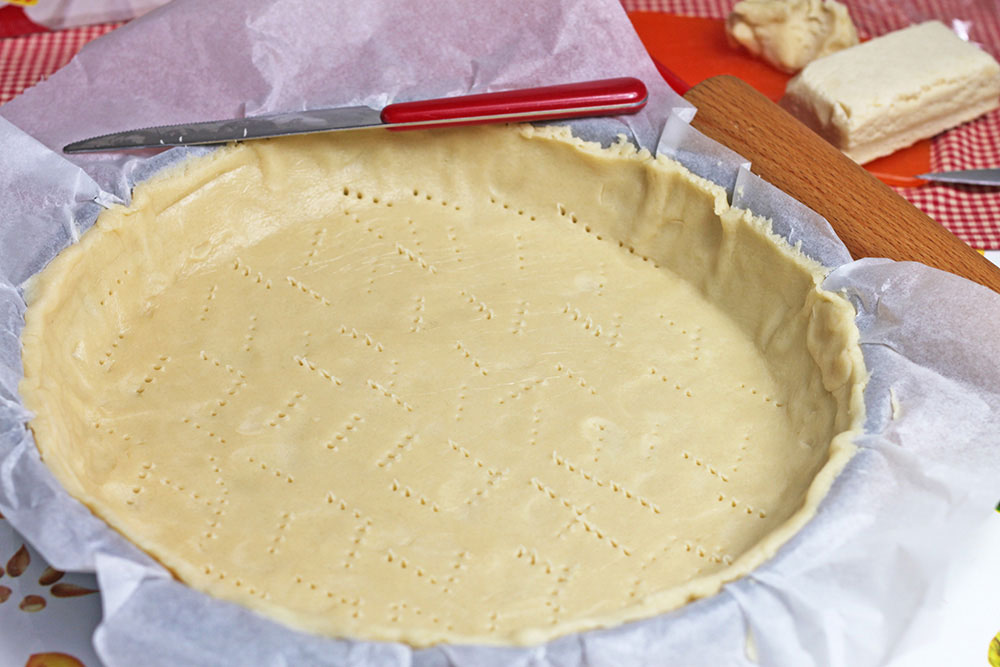Per preparare la pasta frolla seguite le indicazioni riportate in questa ricetta oppure acquistatene 450 grammi. Noi questa volta, per fare prima, l’abbiamo acquistata surgelata.