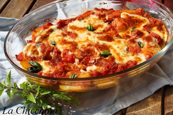 Cottura: 15 minuti per sbollentare le patate + dieci minuti per il sugo di pomodoro + 15 minuti per cottura in forno preriscaldato