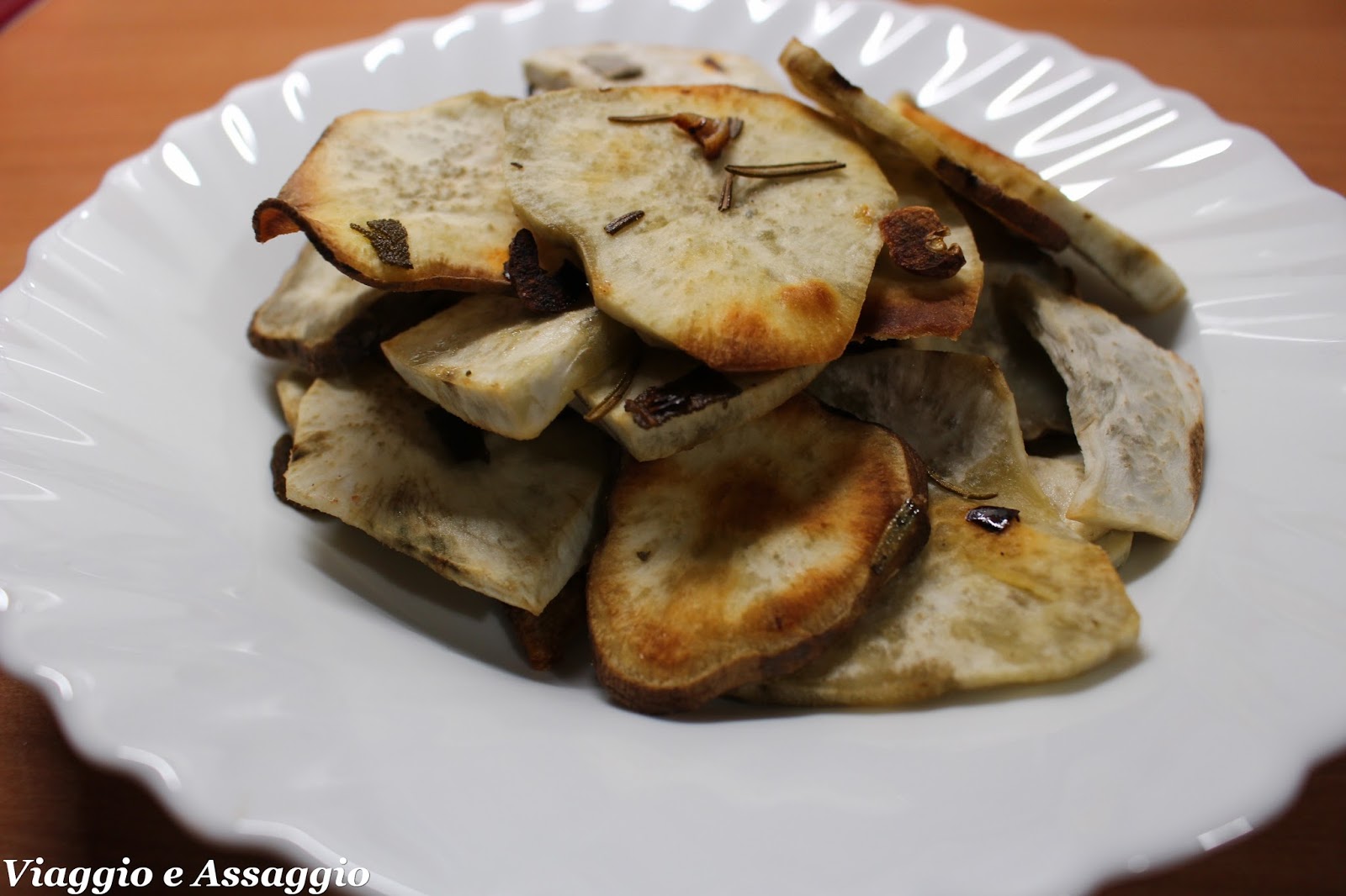 Peel potatoes, wash, dry and cut into slices. Put on a baking sheet covered with parchment paper, add chopped garlic (without soul) , sage, rosemary, chili pepper, a pinch of salt and little extra virgin olive oil.