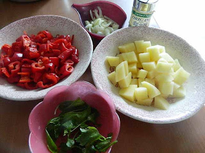Pelare le patate e tagliare a pezzetti, lavare i peperoni, dividerli a metà, togliere i semi e tagliare a pezzi.