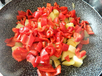 coprire la padella e cuocere per altri 5 minuti, rigirare di tanto in tanto le patate e i peperoni dolcemente cercando di non sfaldare le patate. Servire il contorno caldo o freddo è ottimo sempre.