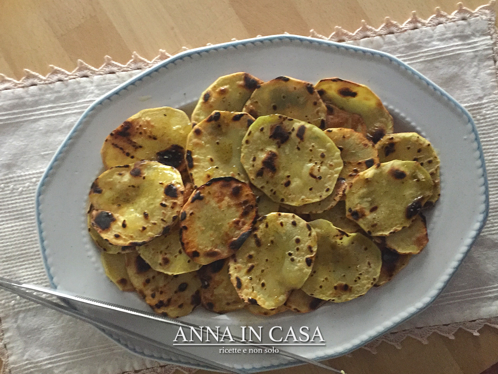 Man mano che sono pronte trasferire le fette di patate su un piatto da portata e irrorarle con l’olio aromatizzato (io ho tolto l’aglio).