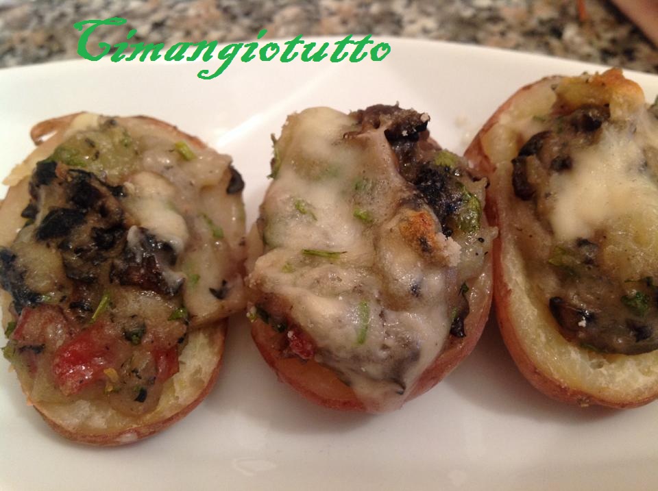 Tagliarle a metà e delicatamente scavarle in modo da formare delle barchette.