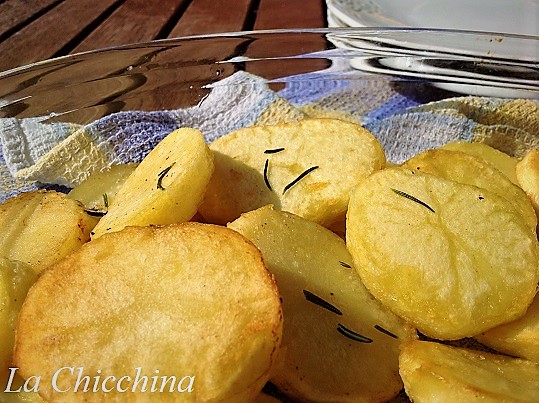 Scaldare una larga padella con l’olio, distribuire le fette di patata, salarle, peparle e profumarle con gli aghi di rosmarino e poco aglio liofilizzato (se gradito).