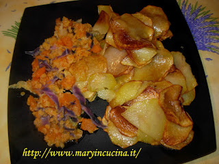 Sbucciare le patate ed affettarle con la mandolina, io le ho affettate un po’ più alte del solito. Friggerle un po’ alla volta e lasciarle qualche minuto su un foglio di carta da cucina per lasciarle perdere un po’ d’olio in eccesso. Nel frattempo tagliare la verdura nella quantità desiderata e farla cuocere in pentola con le lenticchie coperta d’acqua per 15 minuti. Aggiungere un po’ di curry, sale ed un filo d’olio.