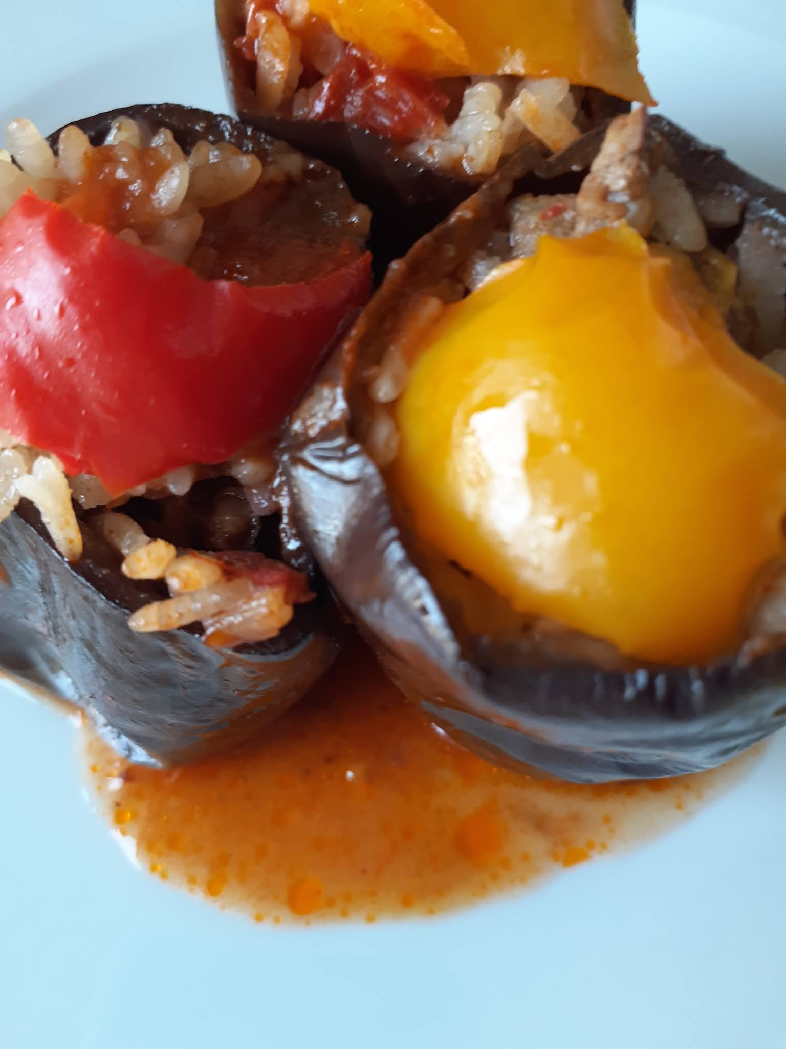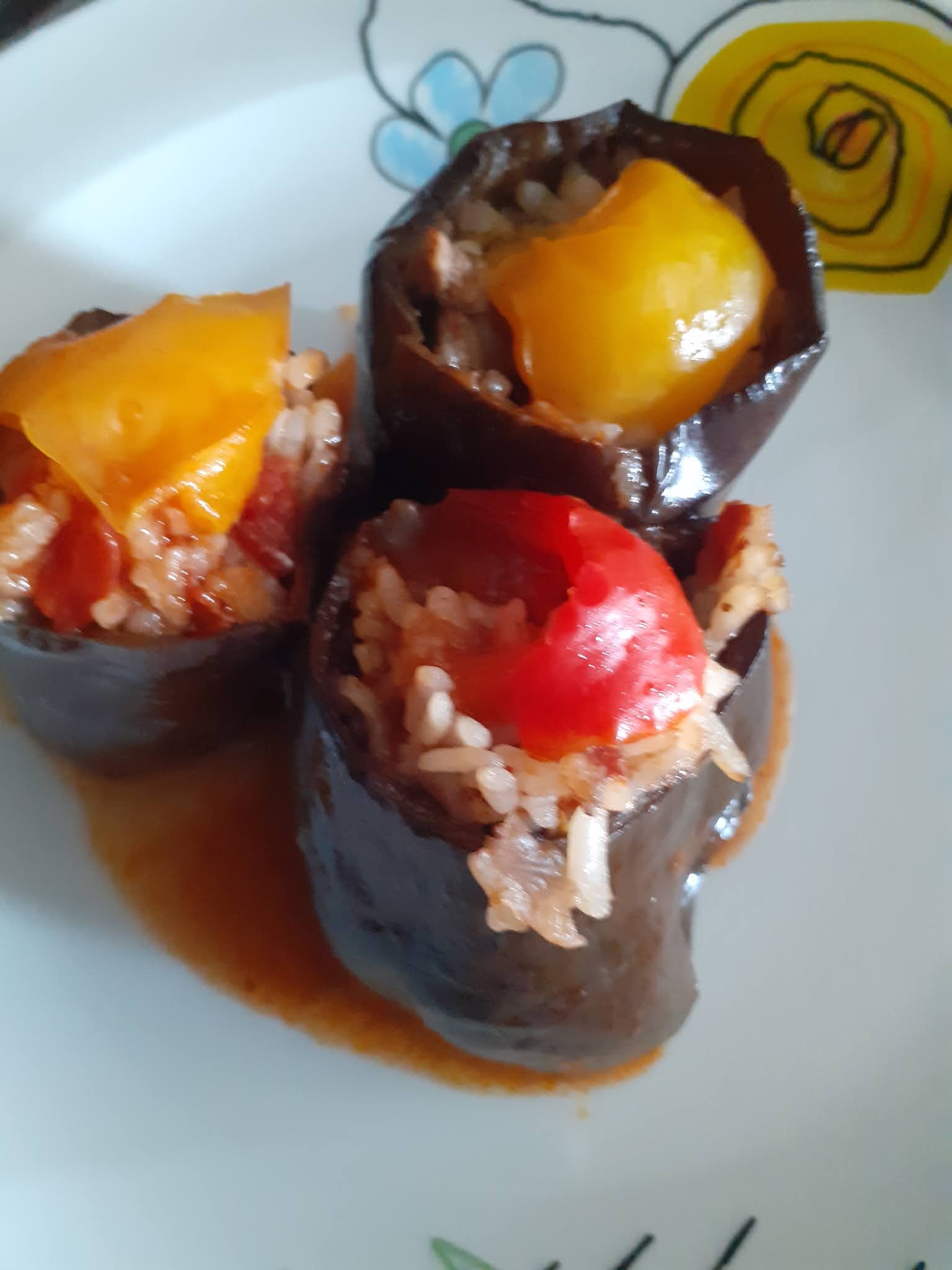 riprendiamo le melanzane ed iniziamo a riempirle (non troppo ) chiudendole con un pezzetto di peperone,le adagiamo poi in una pentola larga (ma tale da non lasciare spazi tra le melanzane),dove sul fondo poggeremo qualche fetta di limone ed avanzi di melanzane, versiamo circa a meta’ con acqua bollente ed ancora poco concentrato, copriamo e portiamo a bollore, poi, abbassiamo la fiamma e portiamo a cottura fino ad eliminare il liquido in eccesso !!!