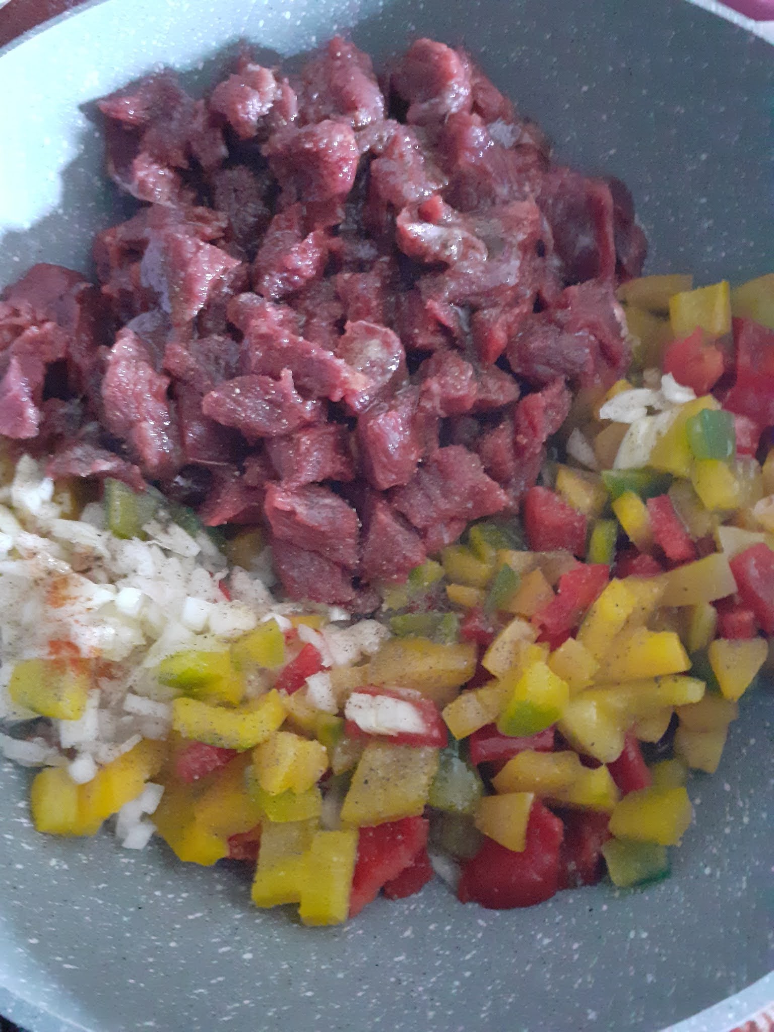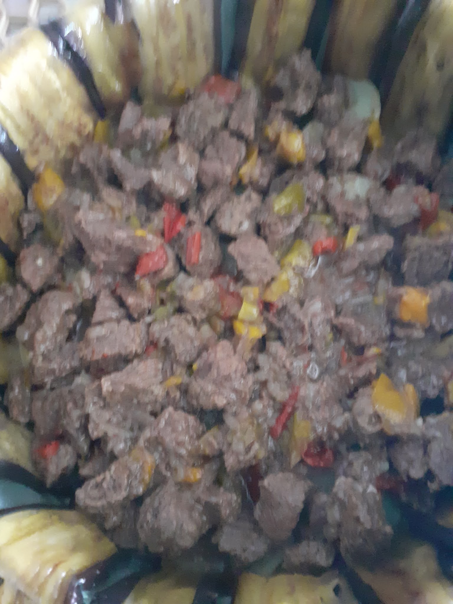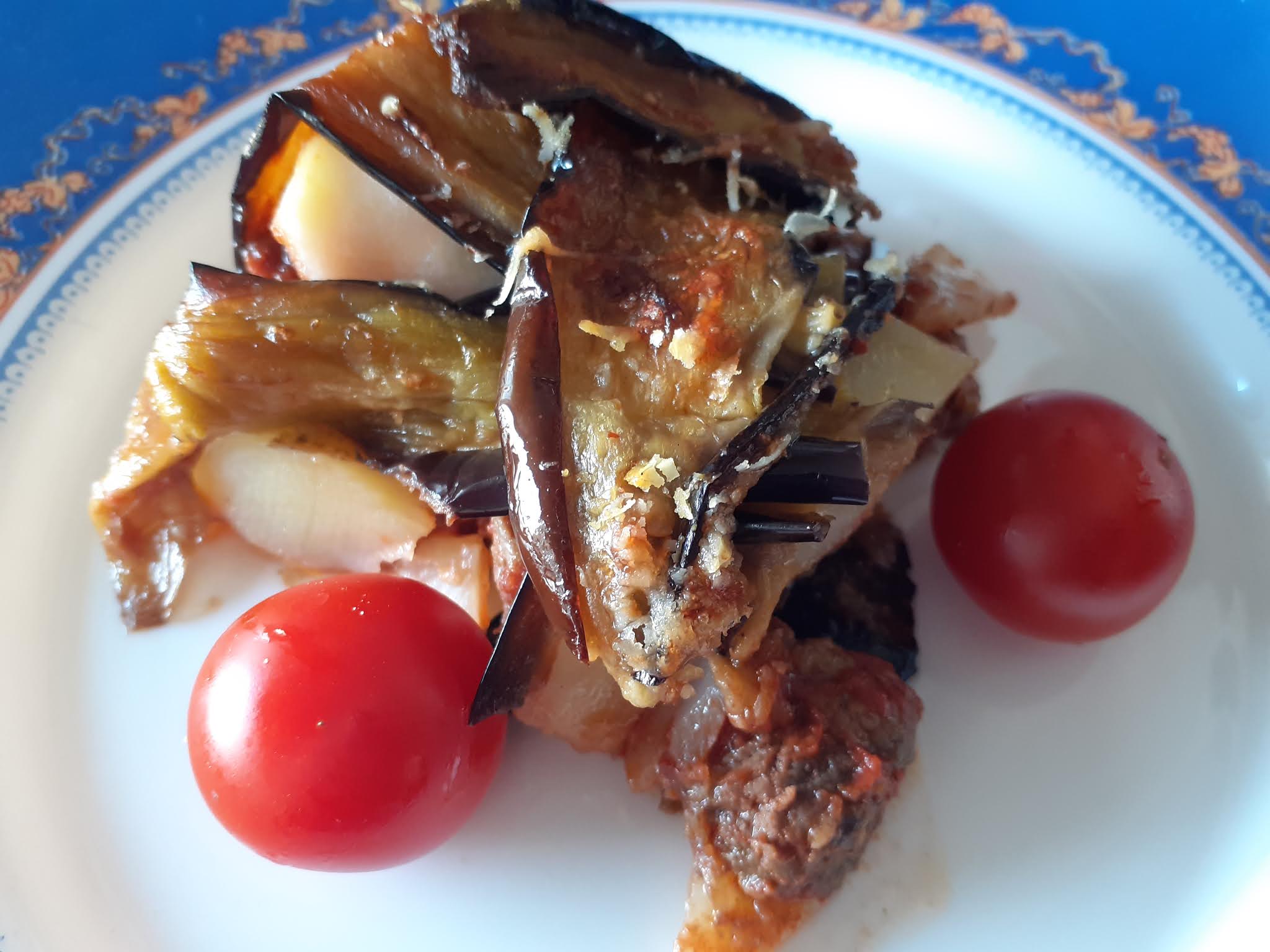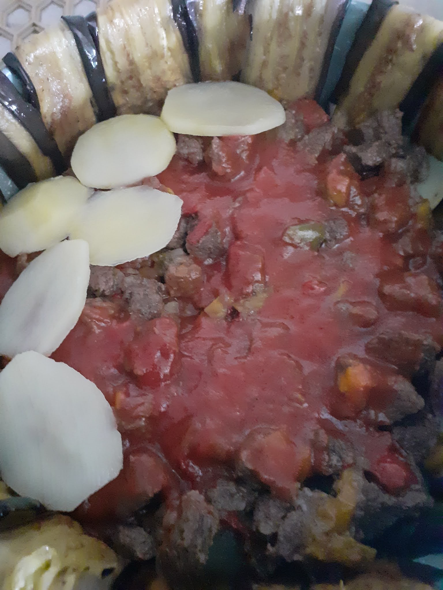 In una casseruola olio, peperoni, cipolla, aglio e carne, uniamo le spezie ed il sale e lasciamo stufare con il coperchio. Intanto friggiamo le melanzane fatte a fette le priviamo con carta casa di eventuale olio in eccesso e le sistemiamo in uno stampo a cerniera ,versiamo sopra la carne cotta, la salsa , adagiamo le fette di patate aggiungiamo l’acqua calda e copriamo il tutto con le melanzane e passiamo in forno a 200° fino a doratura. Estratto dallo stampo decorate e servite con pomodorini !!!