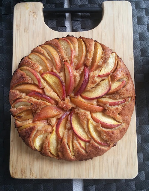 Now take the peach slices and place them over the batter and sprinkle with sugar and cinnamon, finish with small pieces of butter.
