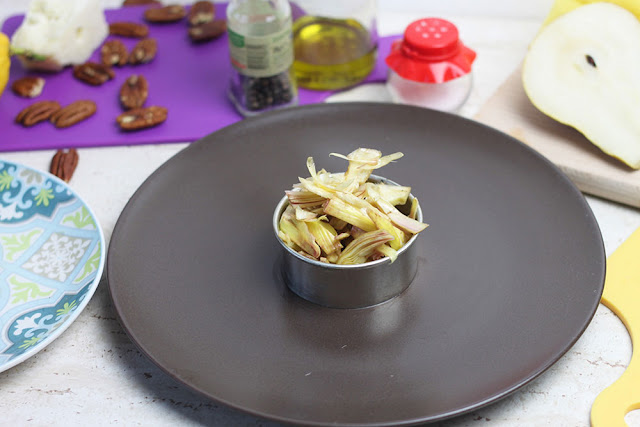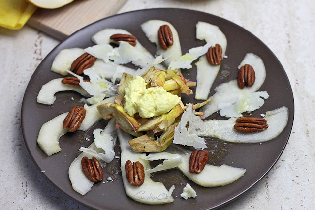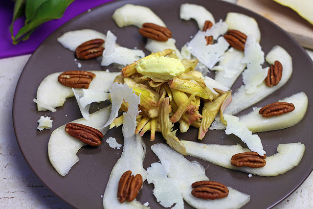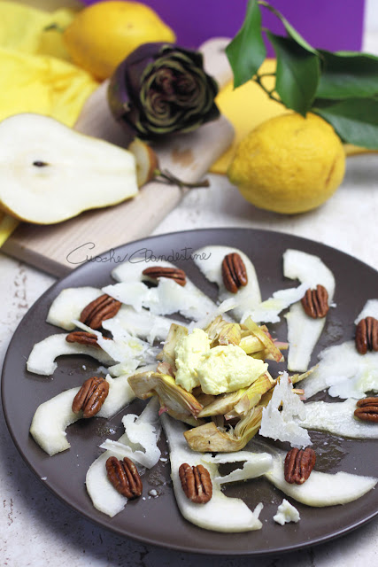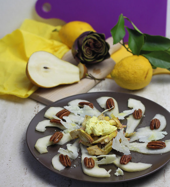 Place the pear slices around the artichokes, as you were making a sort of crown. Then come the pecan nuts. Squeeze the remaining citronnette onto the pears. Let some pecorino cheese flakes fall down on your gorgeous salad (use a sharp knife or a potato hand-cutter). If you want to turn this salad into an unbelievable dish serve with a pair of spoonful of eggless mayonnaise.