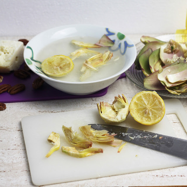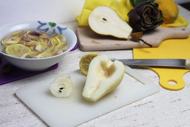 Grab a small bowl, fill with some water and squeeze half a lemon inside. Cut the artichokes into thin strips and put them into the acidulated water.