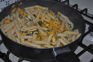 Fate cuocere 320 g di penne in acqua salate lasciandole piuttosto al dente; saltate la pasta in padella e servite!
