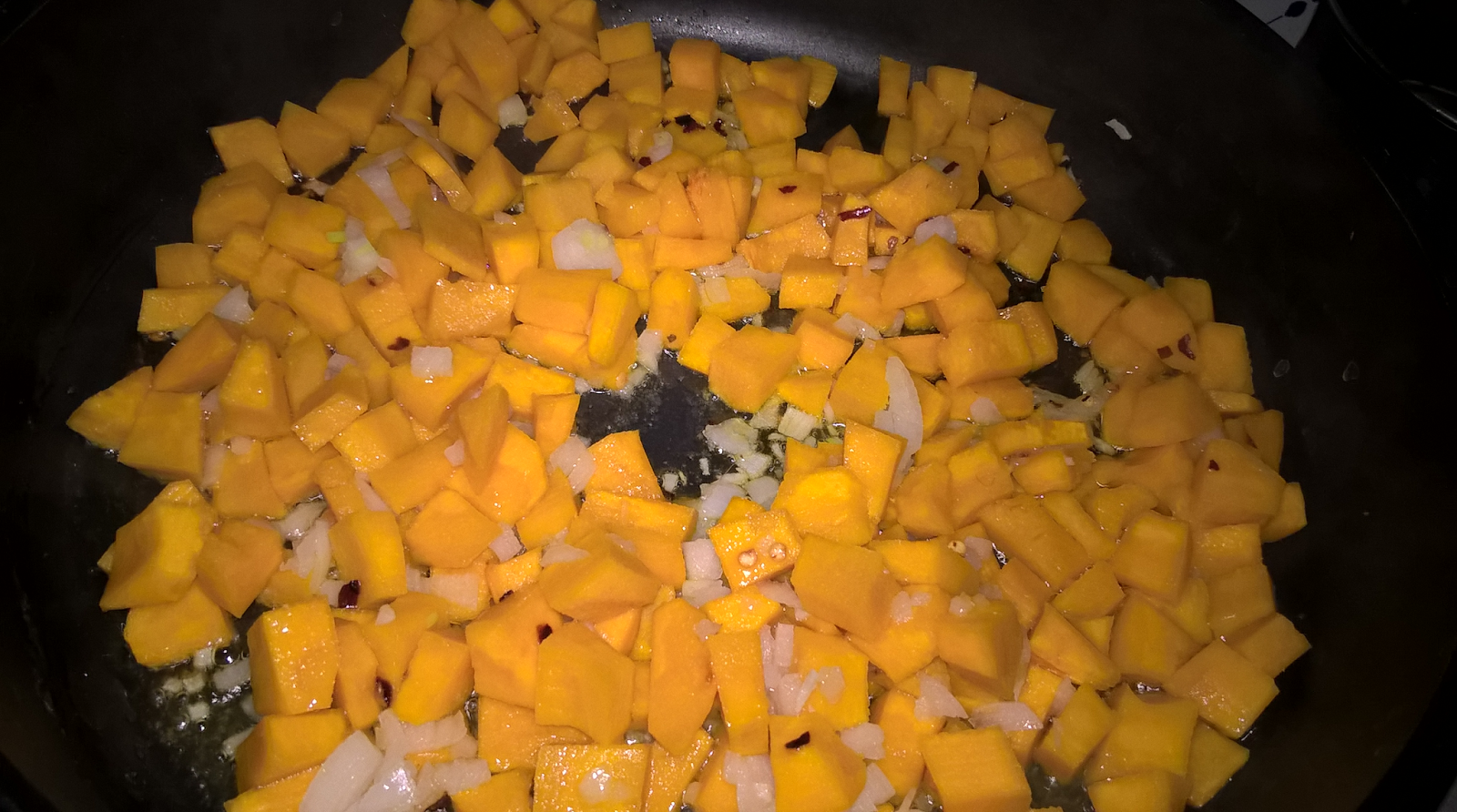 Prendete una fetta di zucca (400 g circa), tagliatela a dadini piccoli.