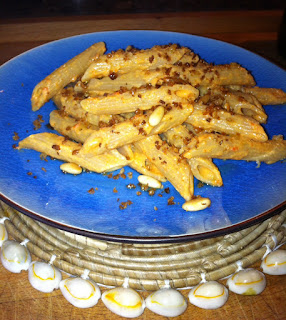 A cottura ultimata condire le penne con la crema ottenuta e aggiungere in ogni piatto un po’ di granella croccante di pane nero e pinoli.