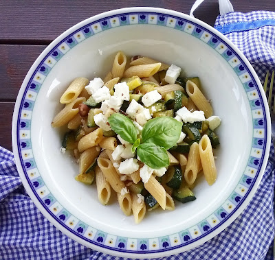 Quando la pasta sarà cotta, aggiungetela alle zucchine, mescolate e appena prima di servire unite il quartirolo tagliato a cubetti e le noci di macadamia tritate grossolanamente.