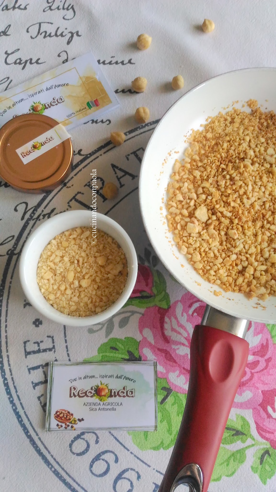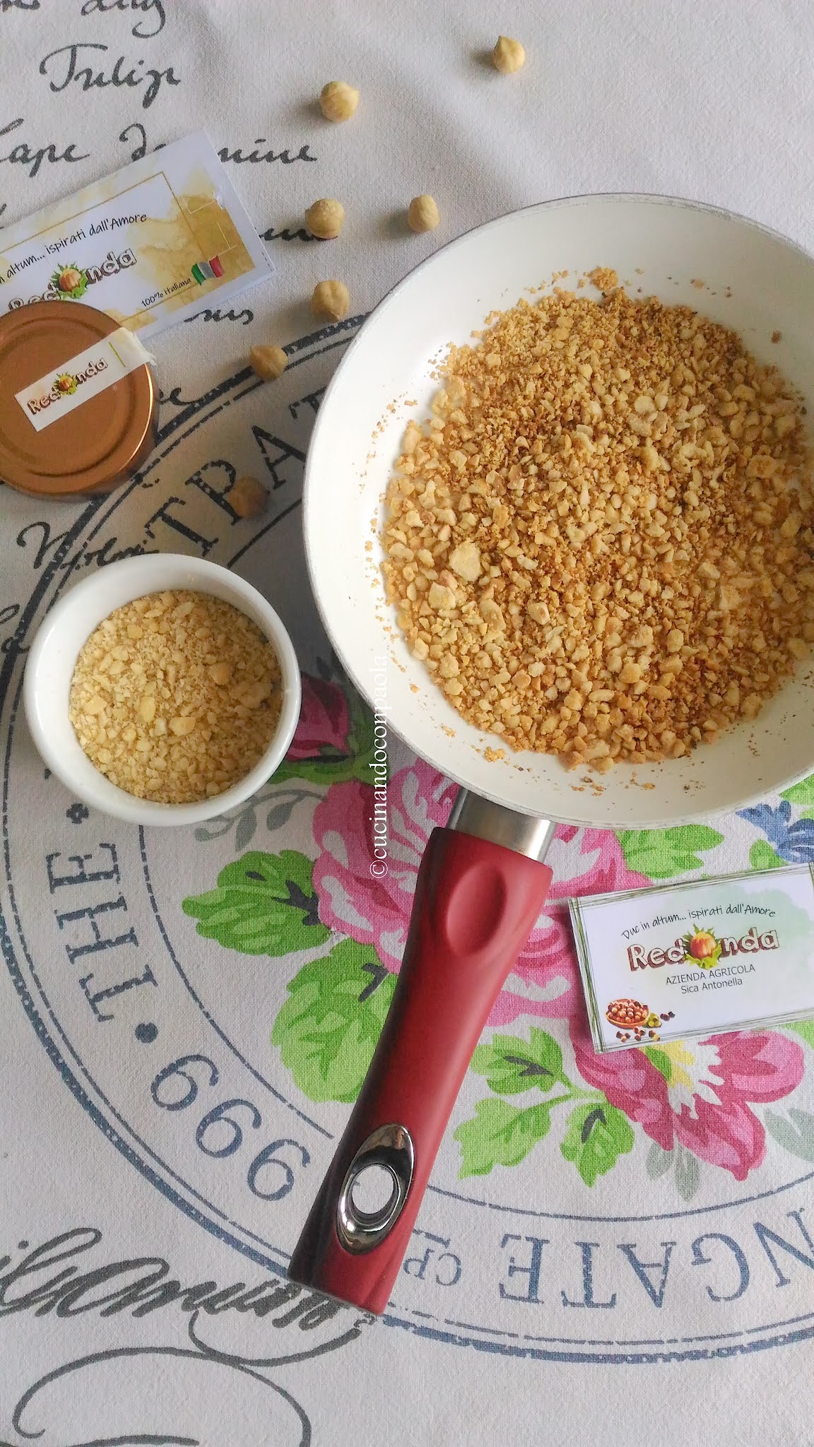 In una padella antiaderente tostiamo la granella di nocciole senza aggiungere l’olio,