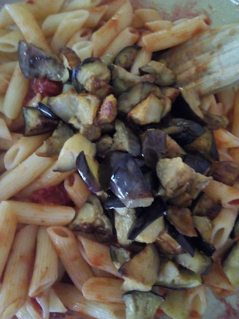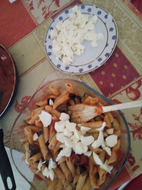 Lasciate cuocere la pasta ed il sugo; nel frattempo preparate una teglia da forno e copritela con un mestolo di sugo, questo vi eviterà che la pasta si attacchi e risulterà più morbida; scolate la pasta al dente ed insaporite con il sugo di melanzane, versate in teglia!