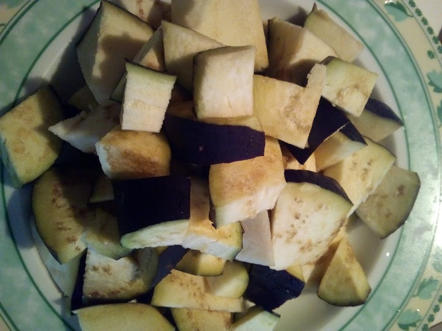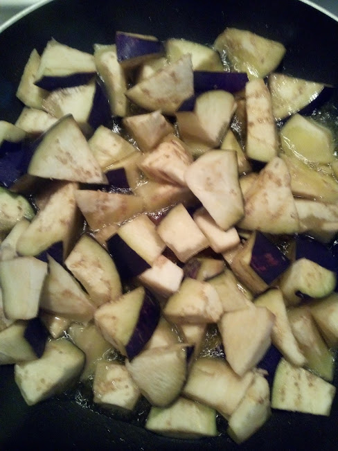 Lavate, pulite e tagliate a tocchetti le melanzane, asciugatele e fatele friggere in abbondante olio. Scolatele e tenetele da parte.